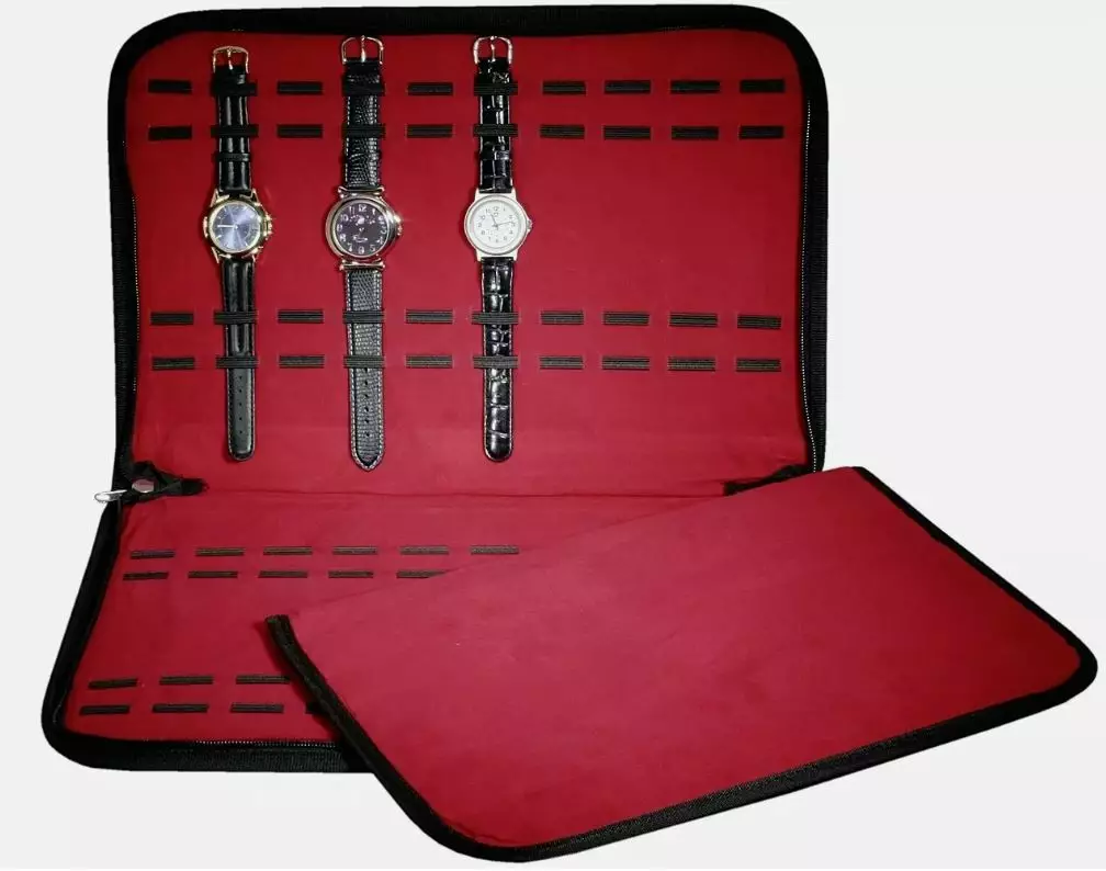 Nahkainen kellolaukku, voit säilyttää jopa 20 rannekelloa yhtä aikaa ja kuljettaa niitä kätevästi mukanasi tarpeen tullen. Ulkokuori mustan sävyinen ja sisältä tummanpunainen. Kellojen väliin saa asetettua "suojaseinän", niin kellot eivät pääse hankaamaan.