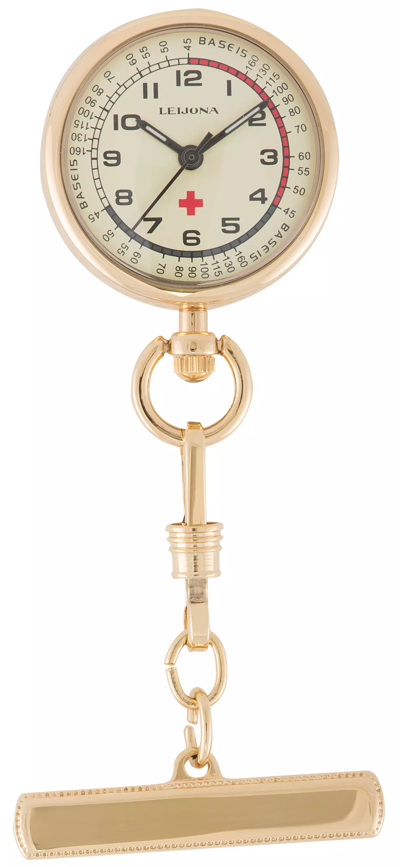Tästä upea Leijona-merkkinen sairaanhoitajankello. Kultaisessa sävyssä, kellotaulun halkaisija 21mm.