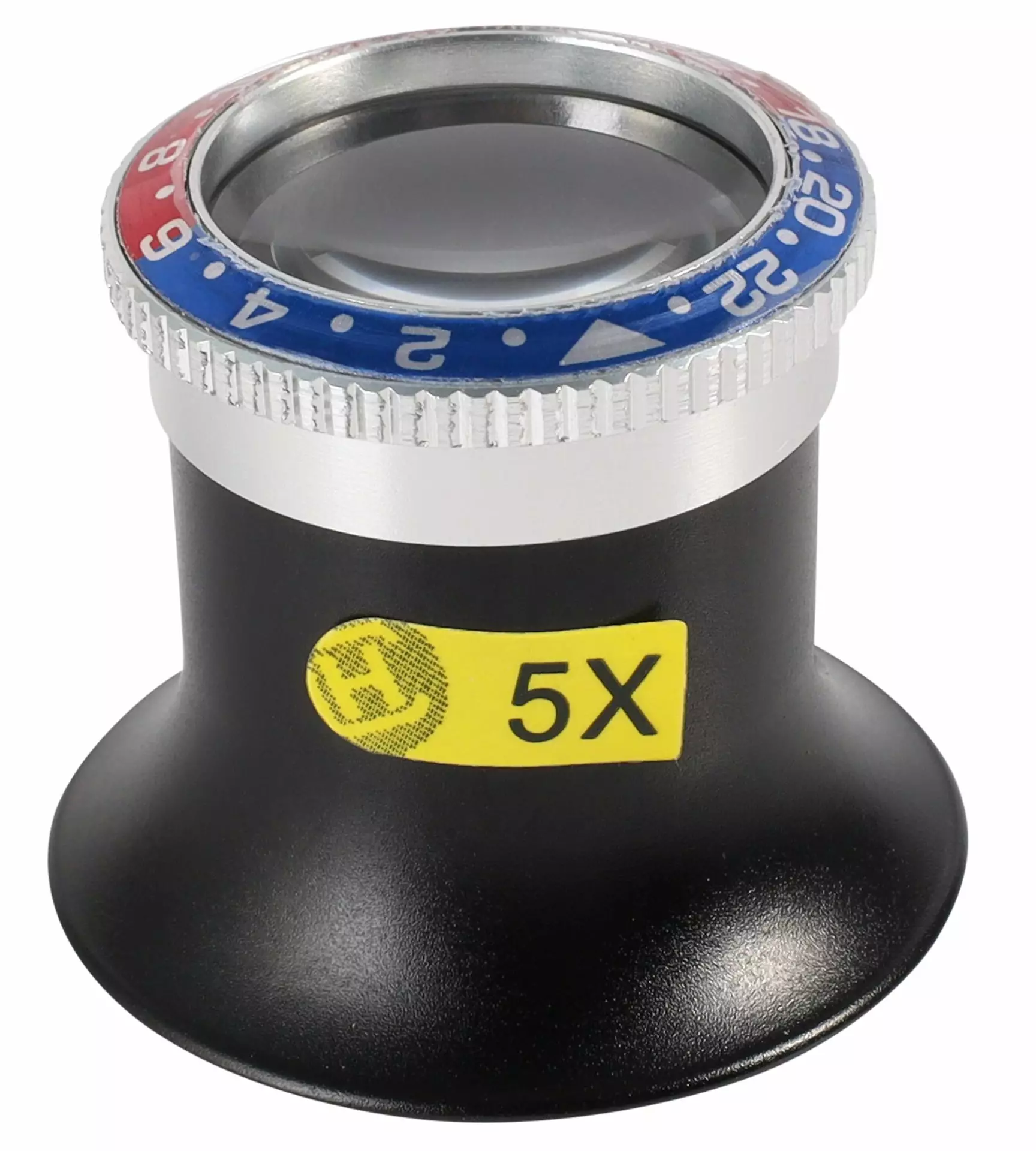 Kellosepän luuppi, 5-kertainen suurennus. Suurennuslasi sopii mukavasti käteen ja on miellyttävän painoinen. Vähentää silmien rasitusta hienotyöskentelyn aikana. Korkeus 4 cm.