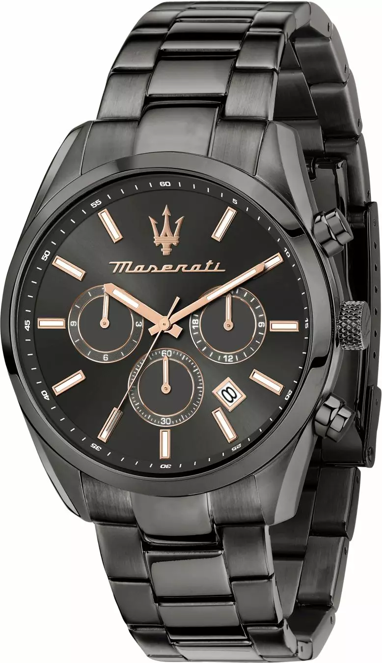 Maseratun Attrazione-sarjan miesten kello. Halkaisijaltaan 43mm, ruostumattomasta teräksestä valmistettu, metallirannekkeellinen malli. Kellosta löytyy kolme pientä erillistä kellotaulua: 12h, 24h näytöt ja erillinen ajanotto taulu.