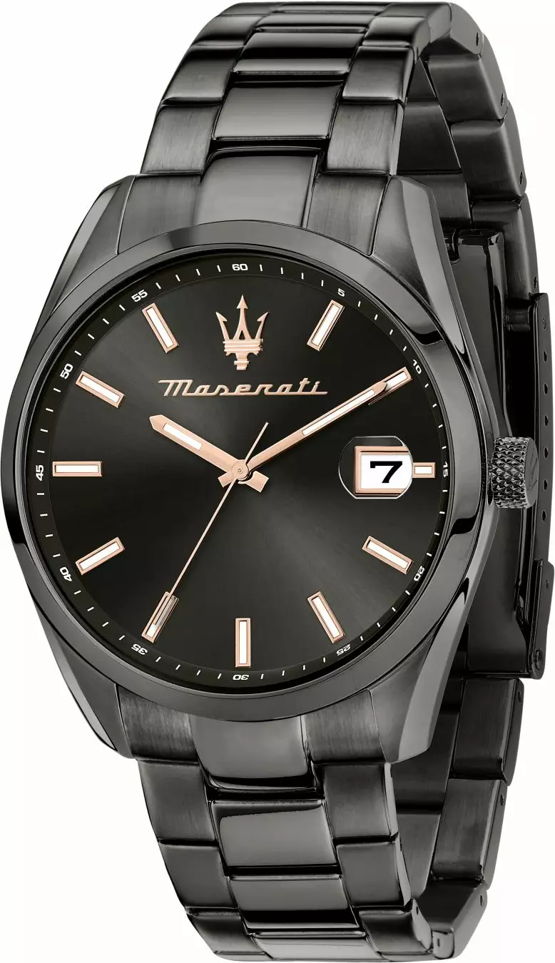 Maserati Attrazione R8853151015 on elegantti ja moderni miesten rannekello, joka heijastaa Maseratin muotoiluperintöä ja huippulaatua. Kellossa on tyylikäs ruostumattomasta teräksestä valmistettu ranneke ja runko, jotka luovat ajattoman ilmeen. Mustassa kellotaulussa on ruusukullan väriset osoittimet ja indeksit sekä päivyri, jotka takaavat selkeän luettavuuden ja lisäävät käytännöllisyyttä. 44 mm kellotaulua suojaa kestävä mineraalilasi.
