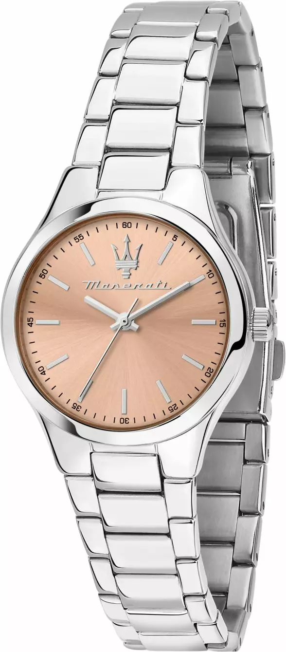 Maserati Attrazione on tyylikäs ja hienostunut rannekello, joka heijastaa Maseratin ikonista muotoilua ja laadukasta viimeistelyä. Tämä kello on suunniteltu naiselle, joka haluaa yhdistää sporttisen ilmeen ja elegantin muotoilun, tehden siitä täydellisen kumppanin sekä arkeen että juhlaan. Kellossa on 30 mm kellotaulu, jossa yhdistyvät ruusukullan sävyinen kellotaulu ja hopeanväriset yksityiskohdat, kuten tuntimerkinnät ja viisarit. Kellon minimalistinen ja tyylikäs muotoilu tekee ajan seuraamisesta selkeää ja helppoa. Tyylikäs Maseratin logo koristaa kellotaulua ja lisää siihen ripauksen ylellisyyttä.