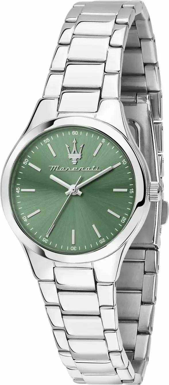 Maserati Attrazione on tyylikäs ja hienostunut rannekello, joka heijastaa Maseratin ikonista muotoilua ja laadukasta viimeistelyä. Tämä kello on suunniteltu naiselle, joka haluaa yhdistää sporttisen ilmeen ja elegantin muotoilun, tehden siitä täydellisen kumppanin sekä arkeen että juhlaan. Kellossa on 30 mm kellotaulu, jossa yhdistyvät vihreän sävyinen kellotaulu ja hopeanväriset yksityiskohdat, kuten tuntimerkinnät ja viisarit. Kellon minimalistinen ja tyylikäs muotoilu tekee ajan seuraamisesta selkeää ja helppoa. Tyylikäs Maseratin logo koristaa kellotaulua ja lisää siihen ripauksen ylellisyyttä.
