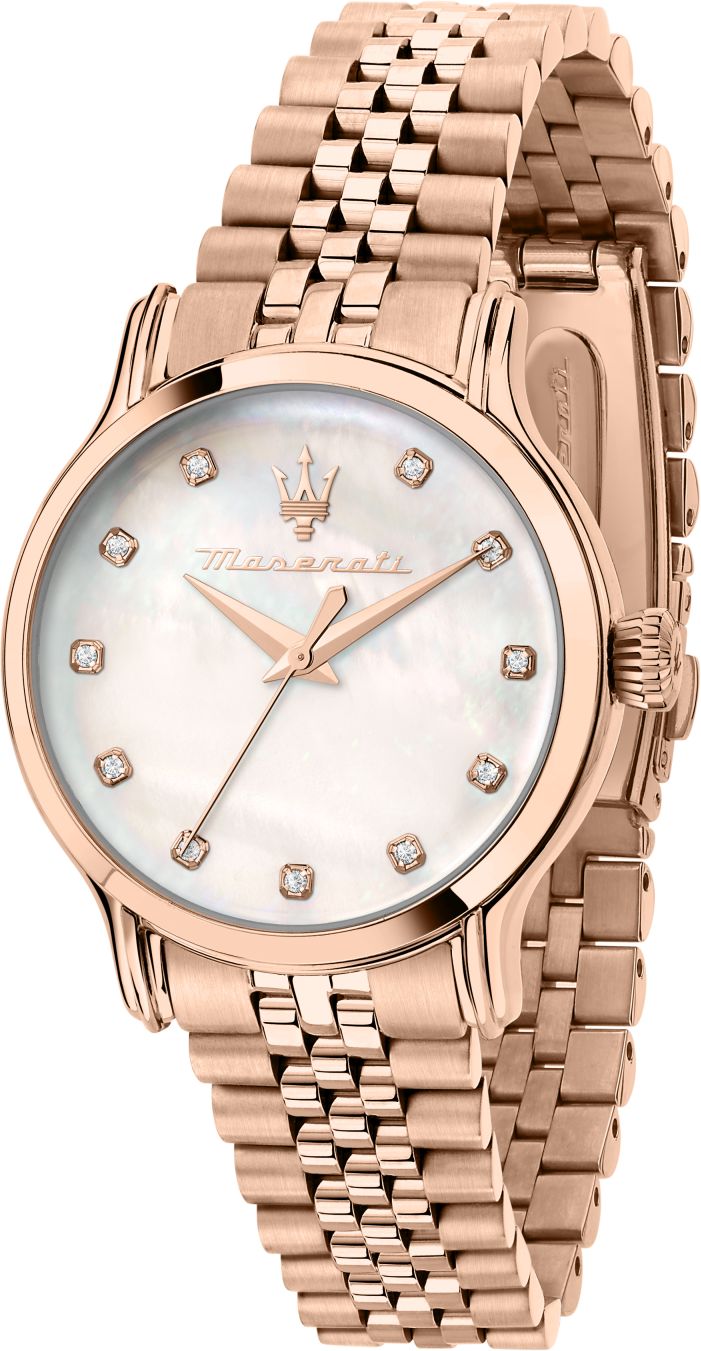 Kellotaulun halkaisija on 34 mm, ja siinä yhdistyvät upea helmiäistausta sekä säihkyvät timantit, jotka koristavat tuntimerkintöjä. Maseratin ikonisella logolla varustettu kellotaulu huokuu luksusta, jonka juuret ulottuvat brändin historiaan.