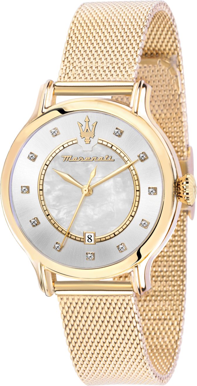 Maserati Epoca R8853118512 on kello, joka kuvastaa Maserati-brändin tinkimätöntä laatua, eleganssia ja tyyliä. Kultainen sävy näkyy kellotaulussa, sen kehällä ja mesh-tyylisessä rannekkeessa. Zirkonkoristelu kellotaulussa antaa viimeisen silauksen kellolle. Tämä malli on myös varustettu päivyrillä, joka on sijoitettu kello kuuteen.
