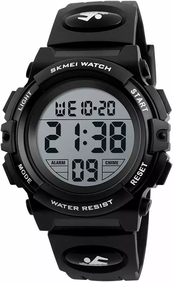 Moderni Skmei S348 -rannekello, mustansävyisenä. Kellosta löytyy niin hälytykset, ajanotto, päivyri kuin 12/24h aikanäkymä. Taustavalolle myös oma painike.