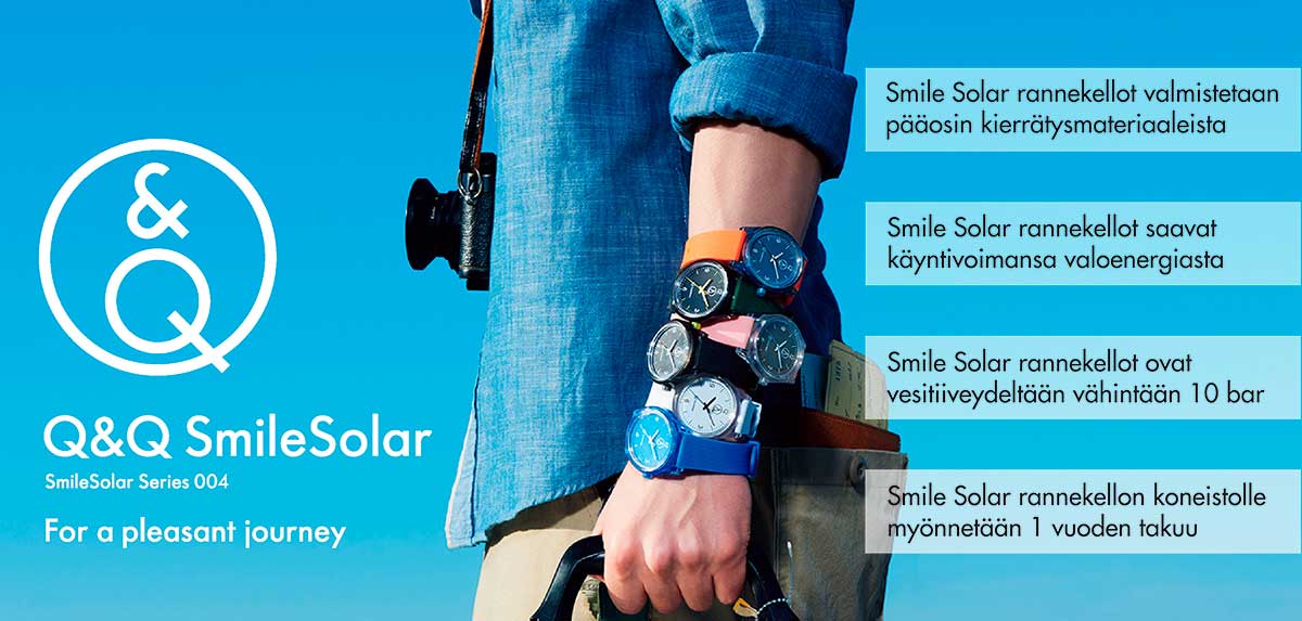 Q&Q:n valmistamat SmileSolar kellot ovat kuin iloisia väriläiskiä, jotka tuovat pirteydellään hymyn huulille. Ainut hymyilyttävä asia ei ole kellojen pirtsakkuus vaan SmileSolar kelloja voi käyttää hymyssä suin myös ympäristön puolesta, kellot on valmistettu pääosin kierrätysmateriaalista ja ne saavat käyntienergian valosta.