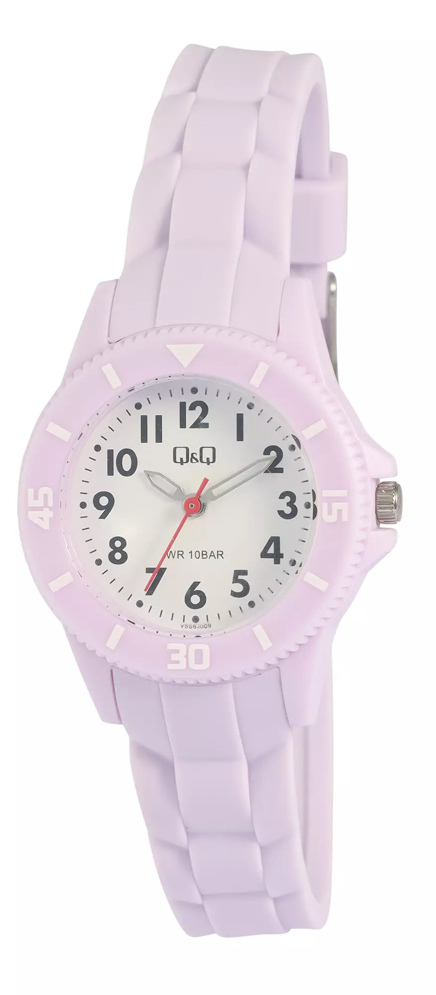 Q&Q merkkinen lasten rannekello. Vaalean violetin värinen silikoniranneke ja kellon kehä. Valkoinen kellotaulu.