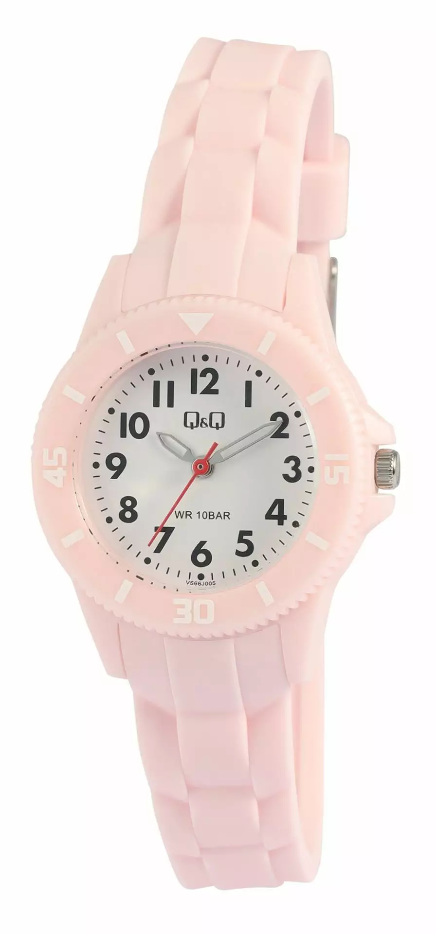 Upea pinkin sävyinen Q&Q merkkinen lastenkello. Helppolukuinen, selkeä kellotaulu, 30 mm halkaisija.