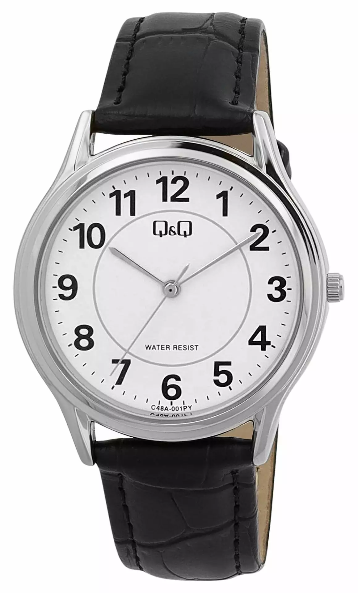 Q&Q Miesten Peruskello C48A-001PY Miesten peruskello, mustalla keinonahkarannekkeella. Halkaisija 36 mm. Selkeälukuinen valkoinen kellotaulu, mustat indeksit. Tuotteen ominaisuudet: Tuotemerkki: Q&Q... Lue lisää