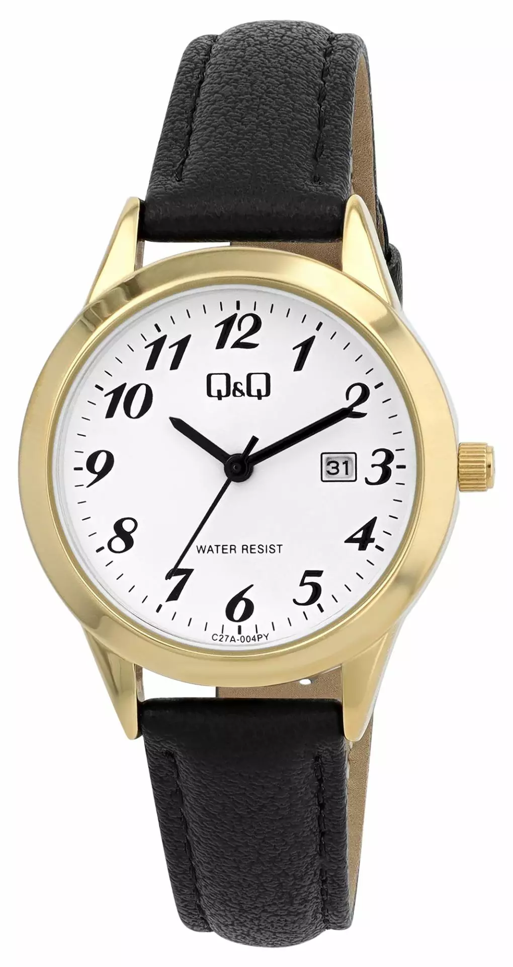 Q&Q tuotemerkin rannekello, nahkasta valmistettu ranneke, valkoinen kellotaulu ja mustat numerot. Lisäksi päivyri kello kolmessa. Kvartsikoneiston ansiosta luotettava ajanotto.