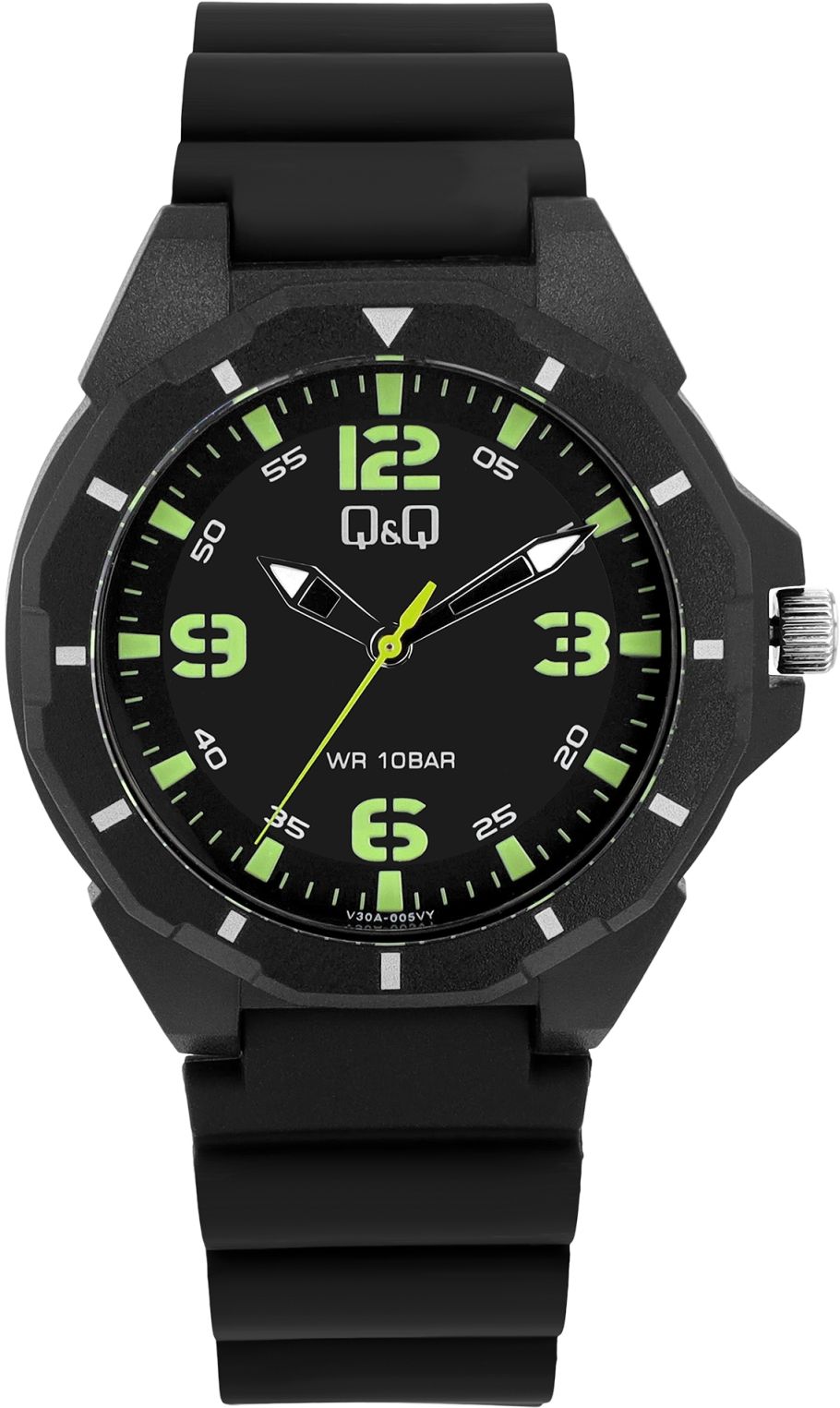 Q&Q miesten rannekello V30A-005VY Q&Q-tuotemerkin analogisessa 3-osoittimisessa kellossa on korkealaatuinen kvartsikoneisto. Musta silikonihihna on 22 mm leveä korvakkeesta ja se voidaan avata ja... Lue lisää