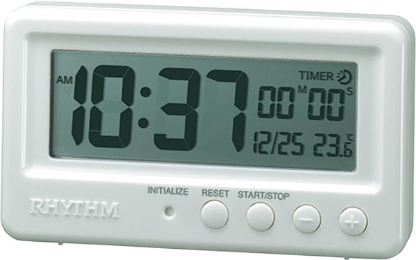 Valkoinen digitaalinen pöytäkello japanilaiselta Rhythmiltä.