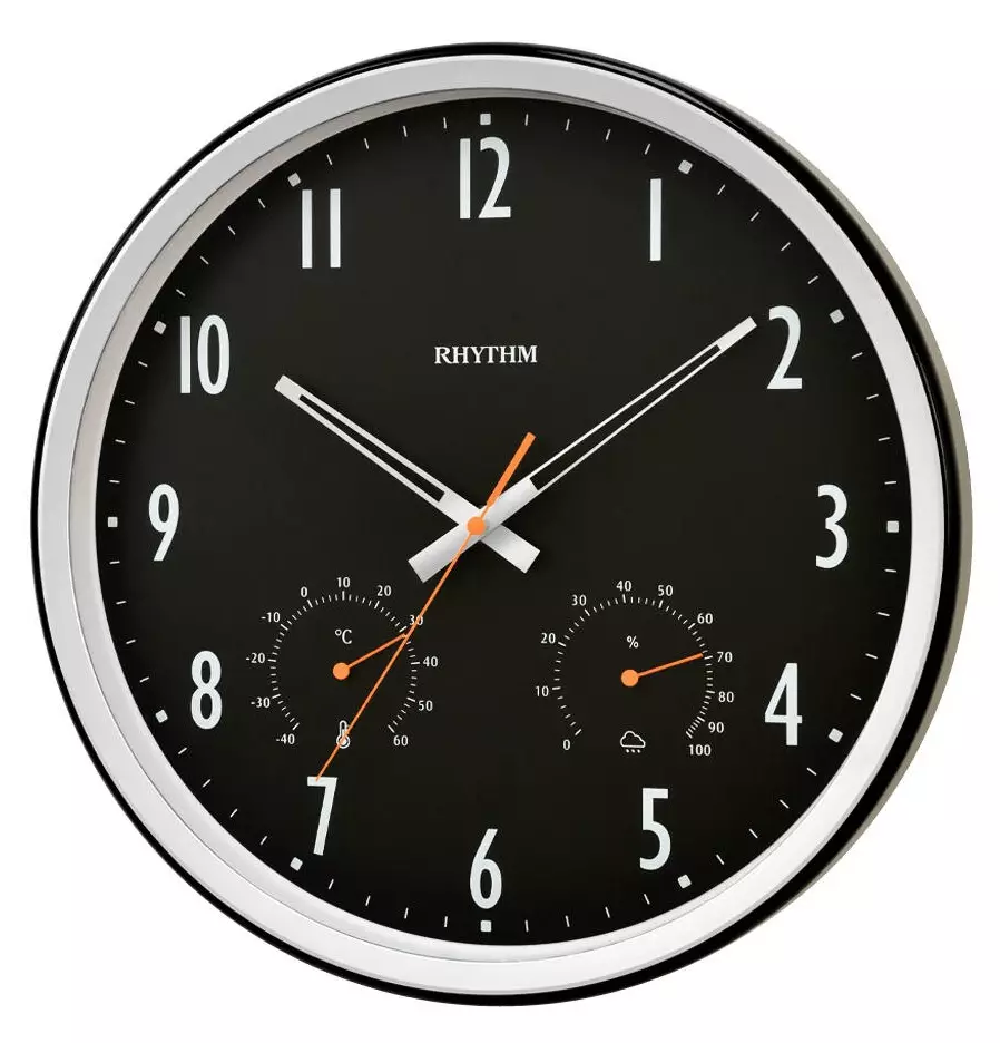 Mustalla kellotaululla varustettu Rhythm merkkinen seinäkello. Kellossa lisäksi analoginen lämpömittari ja kosteusmittari.