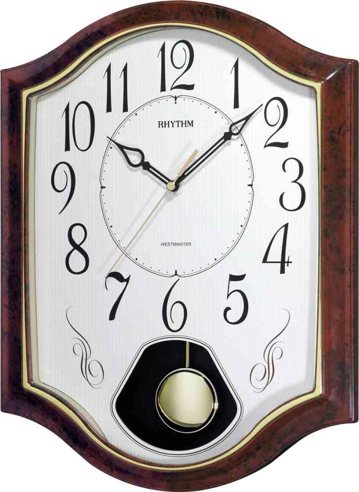Rhythmin valmistama, luotettava seinäkello. Ruskeat kehykset, valkoinen taulu ja mustat koristeelliset viisarit. Westminster & lyönnit, automaattisella yövaimennuksella ja äänenvoimakkuuden säädöllä.