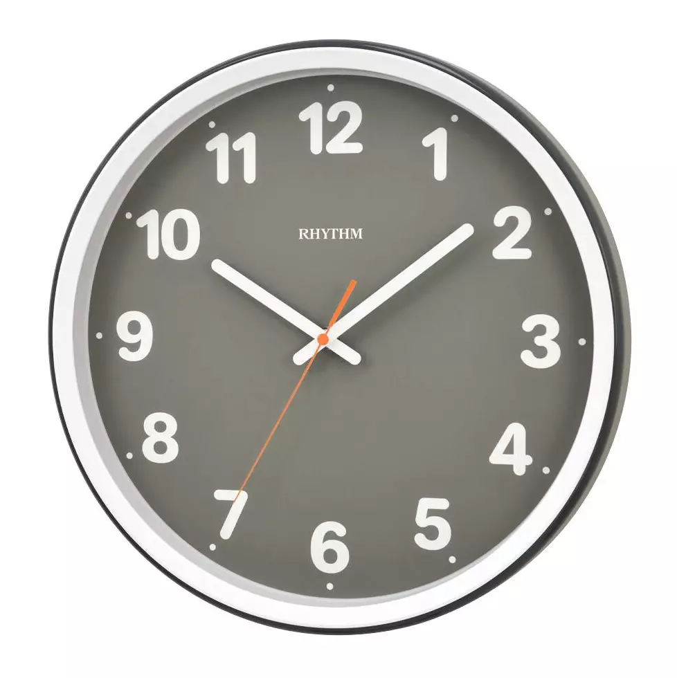 Luotettava Rhythm-merkkinen seinäkello. Harmaalla pohjalla ja selkeillä valkoisilla indekseillä ja osoittimilla. Halkaisija 35cm.