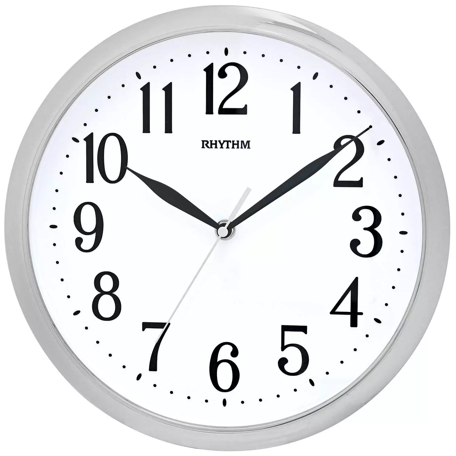 Rhythm-merkkinen seinäkello, hienossa hopean värissä. Mustat selkeät indeksit ja viisarit. Liukuva sekuntiosoitin.