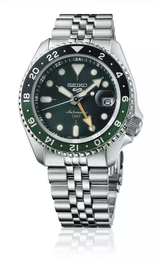 Seiko 5 Sports GMT-sarjan malli, tyylikkyys ja käytännöllisyys samassa paketissa. GMT-toiminto mahdollistaa toisen aikavyöhykkeen seuraamisen helposti. Kellotaulua reunustaa erillinen 24 tunnin kehä ja lisäksi taulussa on oma keltaisen sävyinen GMT-viisari. Ruostumattomasta teräksestä valmistettu kuori ja ranneke. Automaattikoneisto takaa luotettavan suorituskyvyn ja jopa 41 tunnin käyntivaran. Osoittimissa ja indekseissä lumibrite ominaisuus eli hohtavat pimeässä. Kello kolmesta löytyy päivyri suurennuslasilla.