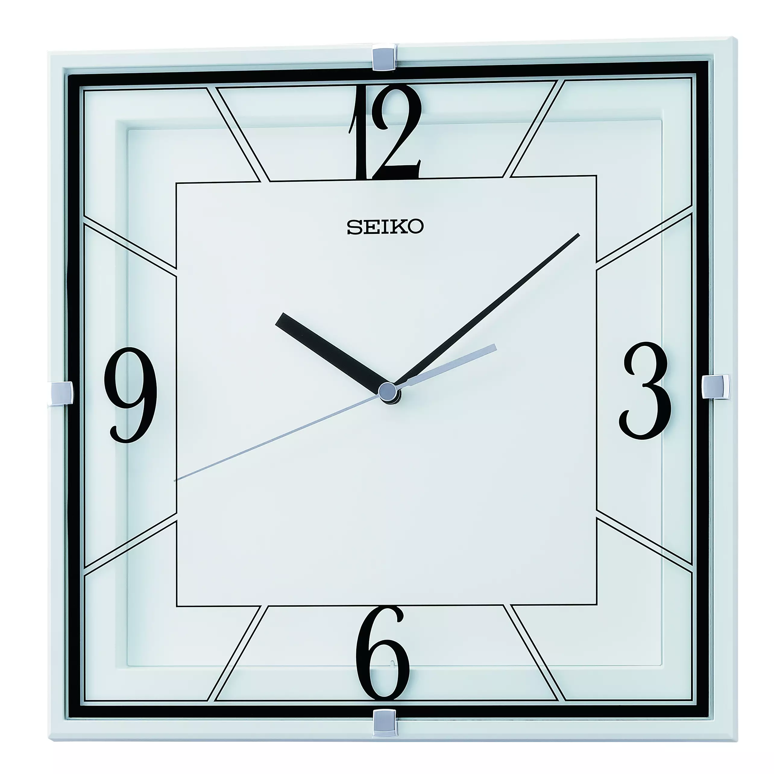 Seikon valmistama neliönmuotoinen seinäkello. Kello on leveydeltään 29,6 cm, paksuus 4,1 cm. Mustat tunti sekä minuuttiviisarit, numeroindeksit klo 3, 6, 9 ja 12 kohdissa.