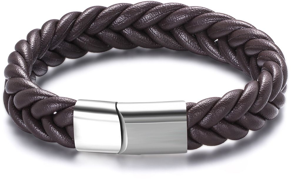 Tyylikäs punottu nahkaranneke teräksisellä lukolla.