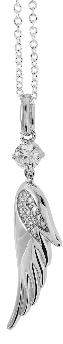 Kaunis Enkelinsiipi kaulakoru, jota koristavat kauniit zirkonit. Riipuksen koko on n.36x10mm. Ketju 45cm.