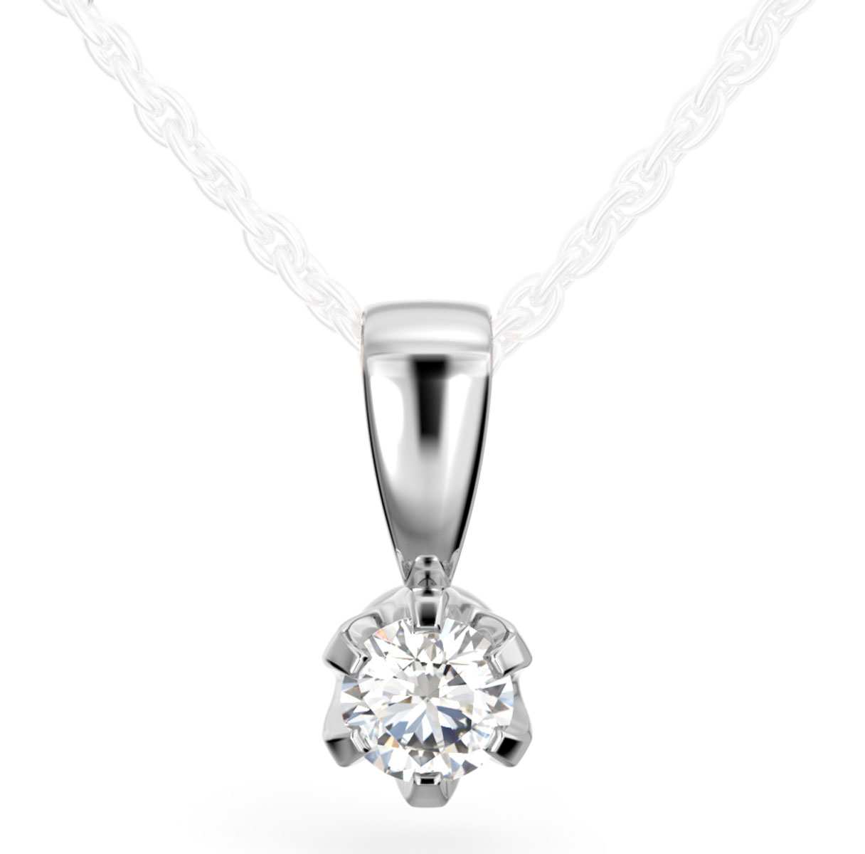 Kaunis valkokullasta valmistettu timanttiriipus, jonka keskustassa säihkyy 0,15karaatin painoinen timantti.