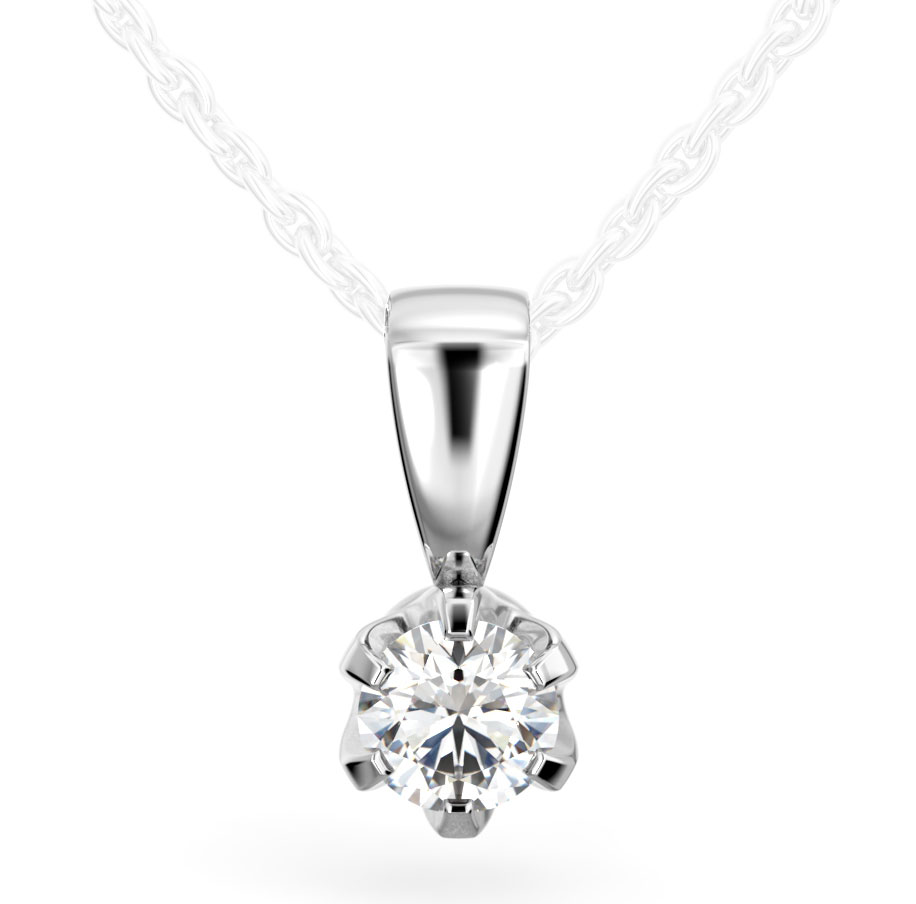 Kaunis valkokullasta valmistettu timanttiriipus, jonka keskustassa säihkyy 0,20 karaatin painoinen timantti.