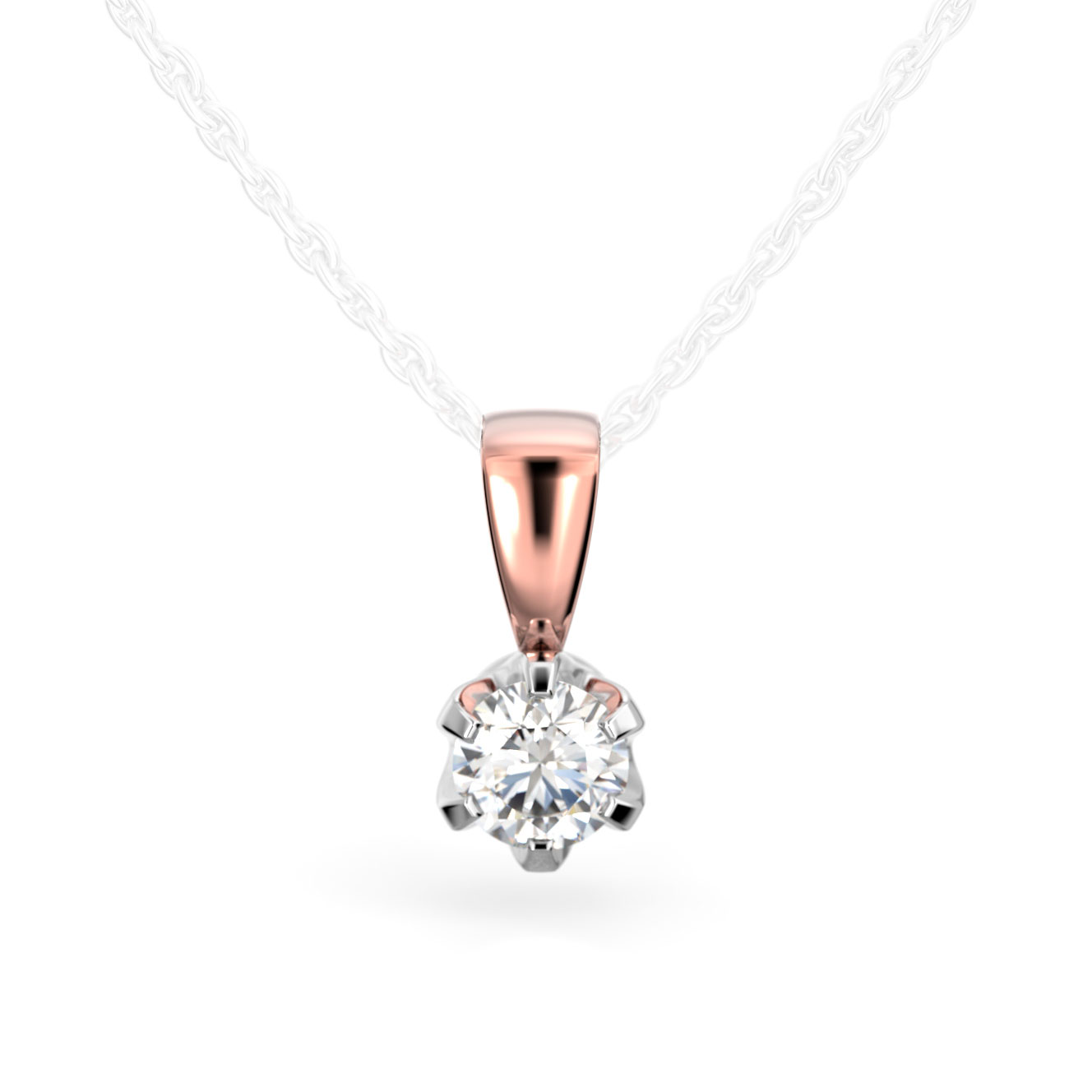 Kaunis puna- ja valkokullasta valmistettu timanttiriipus, jonka keskustassa säihkyy 0,25 karaatin painoinen timantti.