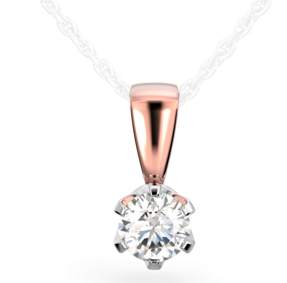 Kaunis puna- ja valkokullasta valmistettu timanttiriipus, jonka keskustassa säihkyy 0,30 karaatin painoinen timantti.