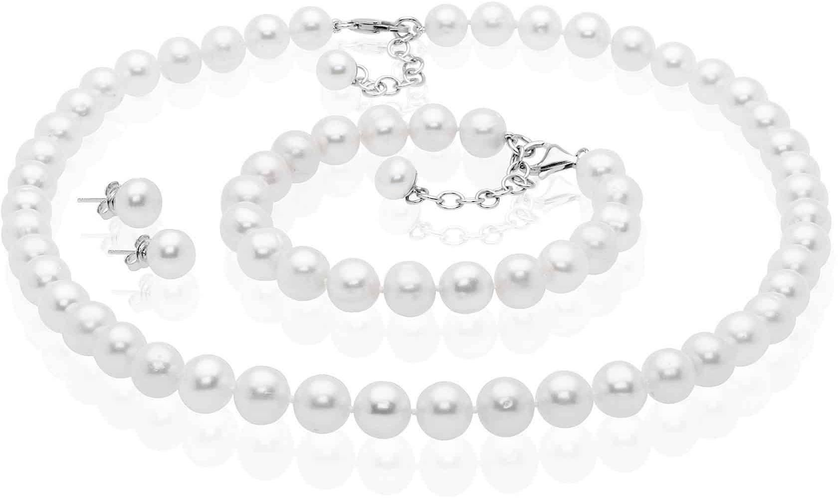 Tuotesetti sisältää 45cm helminauhan, 18/19cm rannekorun sekä korvakorut valitulla helmikoolla.