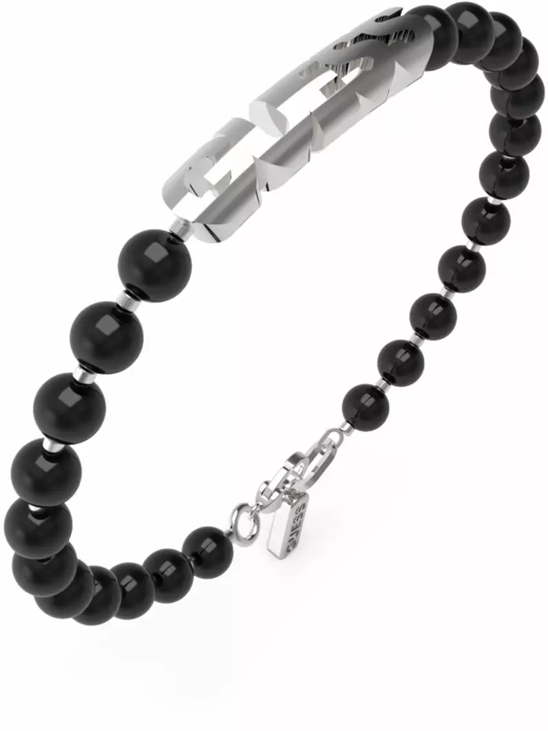 Onyksihelmet rytmittävät rannekorun ilmettä ja tuovat siihen hienovaraisesti syvyyttä, kun taas Guess-logo metalliyksityiskohdat viimeistelevät kokonaisuuden tyylikkäästi.