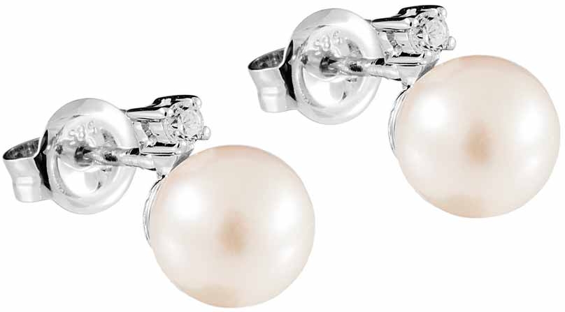 Kauniit 14 karaatin valkokullasta valmistetut helmikorvakorut, joita koristavat kauniit zirkonit.