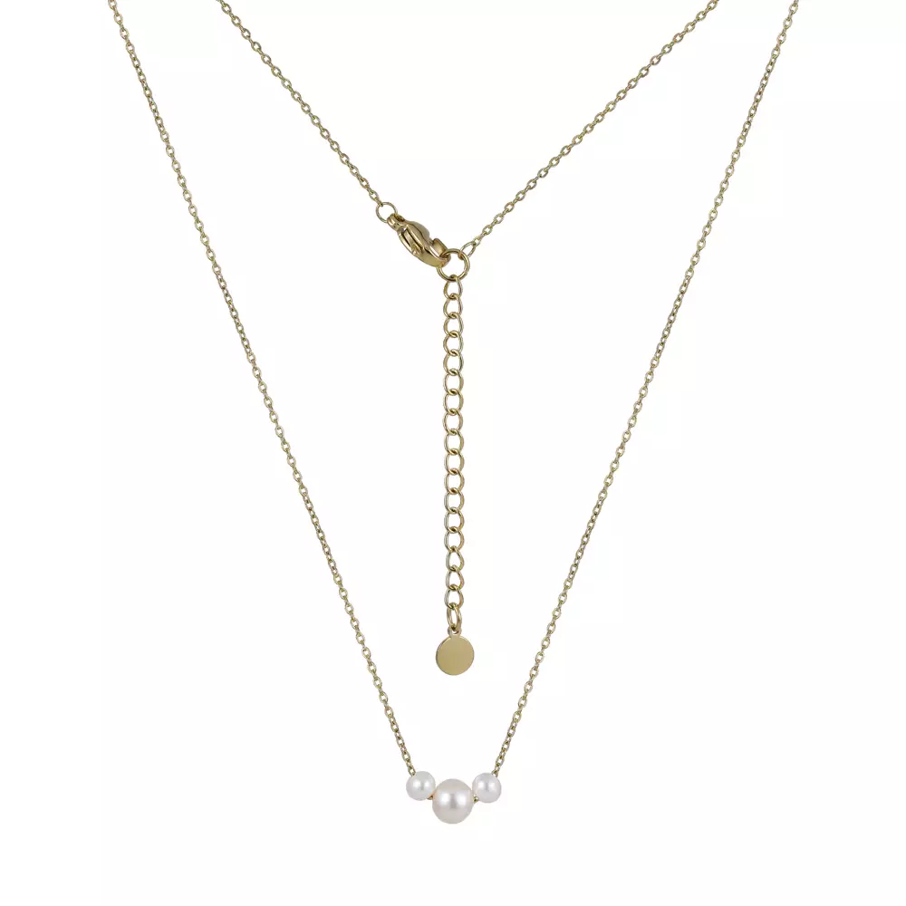 Siro ja tyylikäs helmiriipus. Kullatussa teräsketjussa yksi isompi helmi (6mm) ja kaksi pienempää (4mm) molemmin puolin. Ketjun pituus säädettävissä 45-50cm välillä.