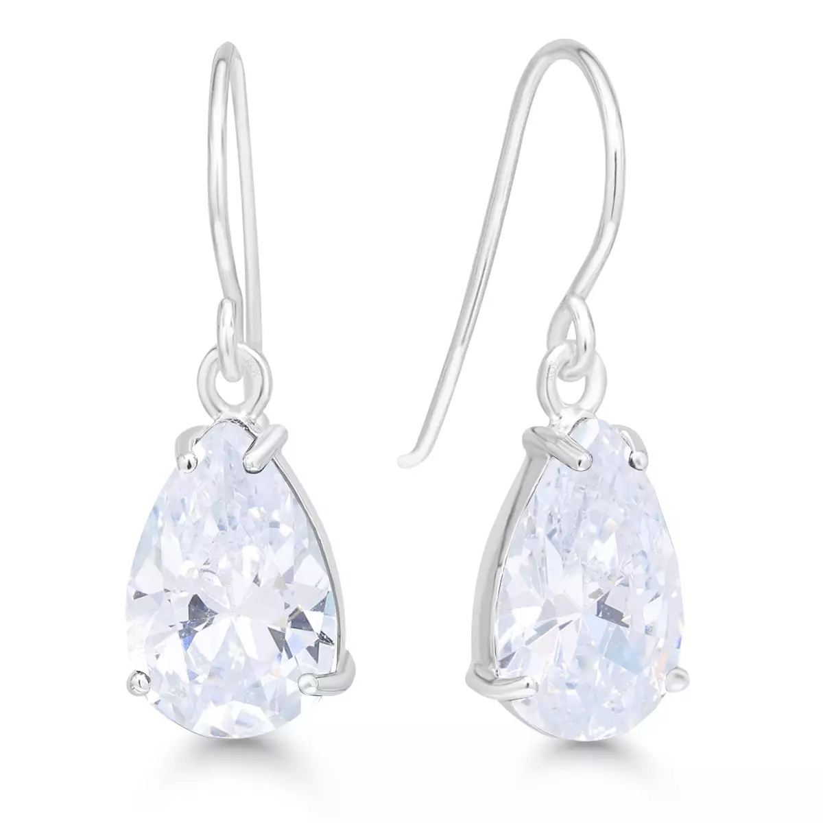Hopeasta valmistetut roikkuvat korvakorut. Iso, upea, kirkas pisaranmuotoinen zirkoni.
