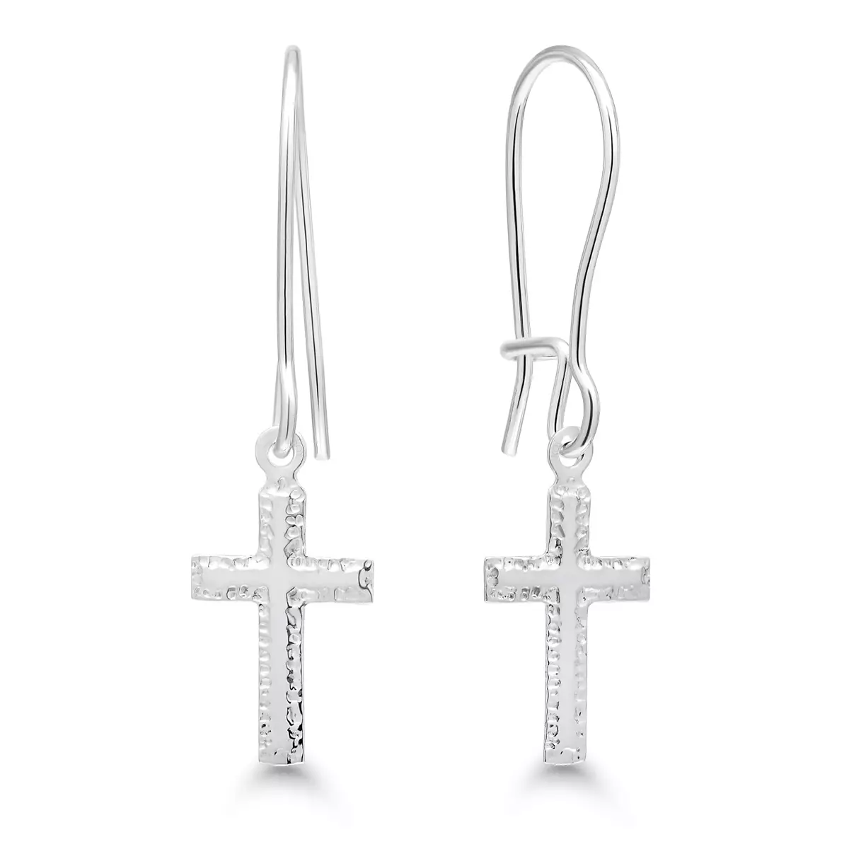 Hopeasta valmistetut koukkukorvakut. Upea noin 14 mm korkea risti antaa lopullisen säväyksen.