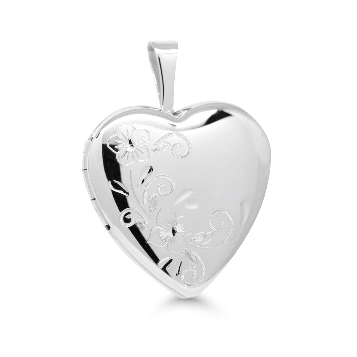 Ihastuttava sydänmedaljonki, jonka kiiltävää pintaa halkoo kaunis kaiverrettu kukkakuvio.