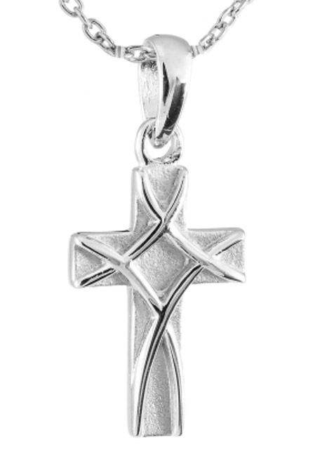 Hopeasta valmistettu, tyylikkäällä ulkonäöllä varustettu risti. Ristin pinnassa koholla hienoa kuviointia.