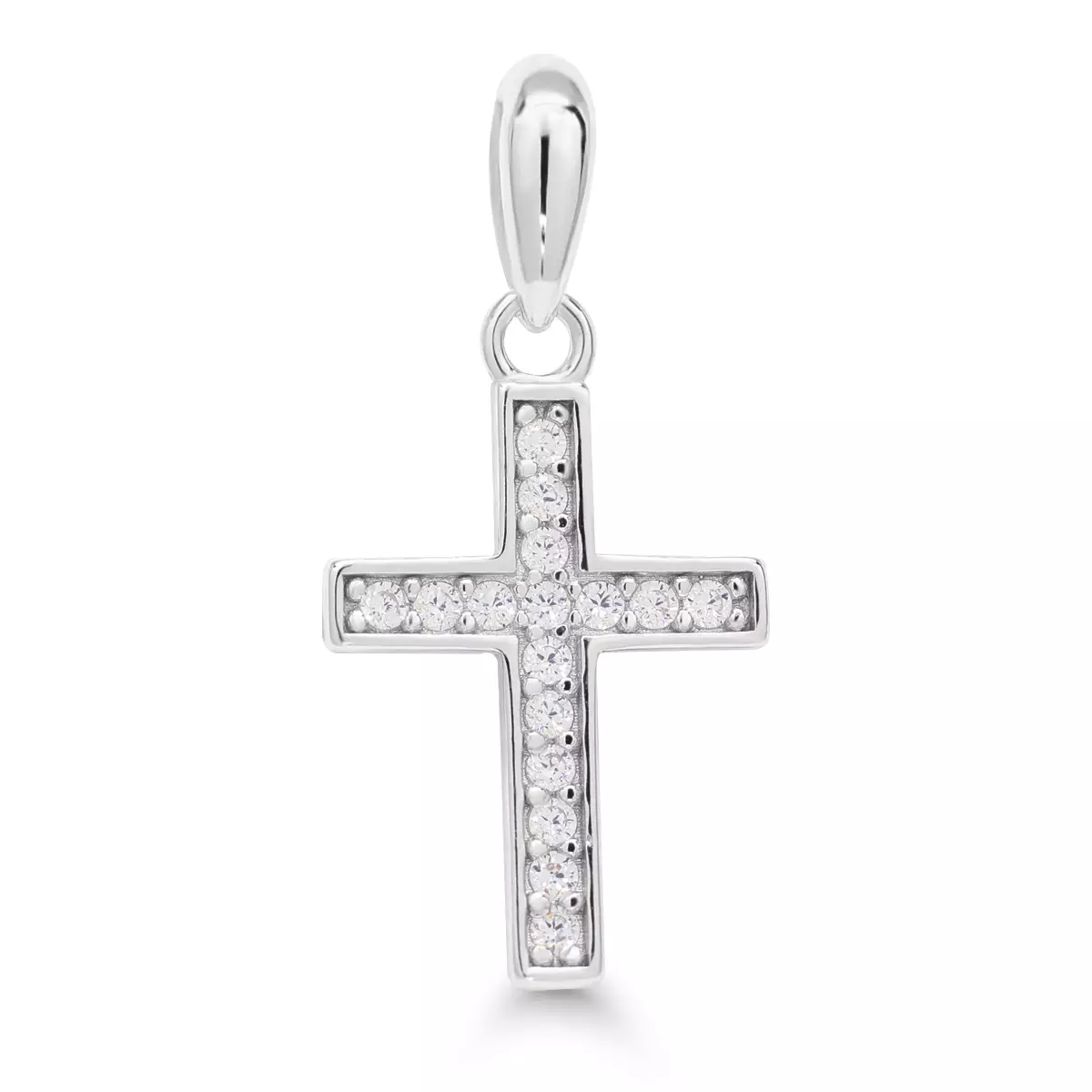 Kaunis hopeinen ristiriipus, jonka kruunaa kirkkaat zirkonit.