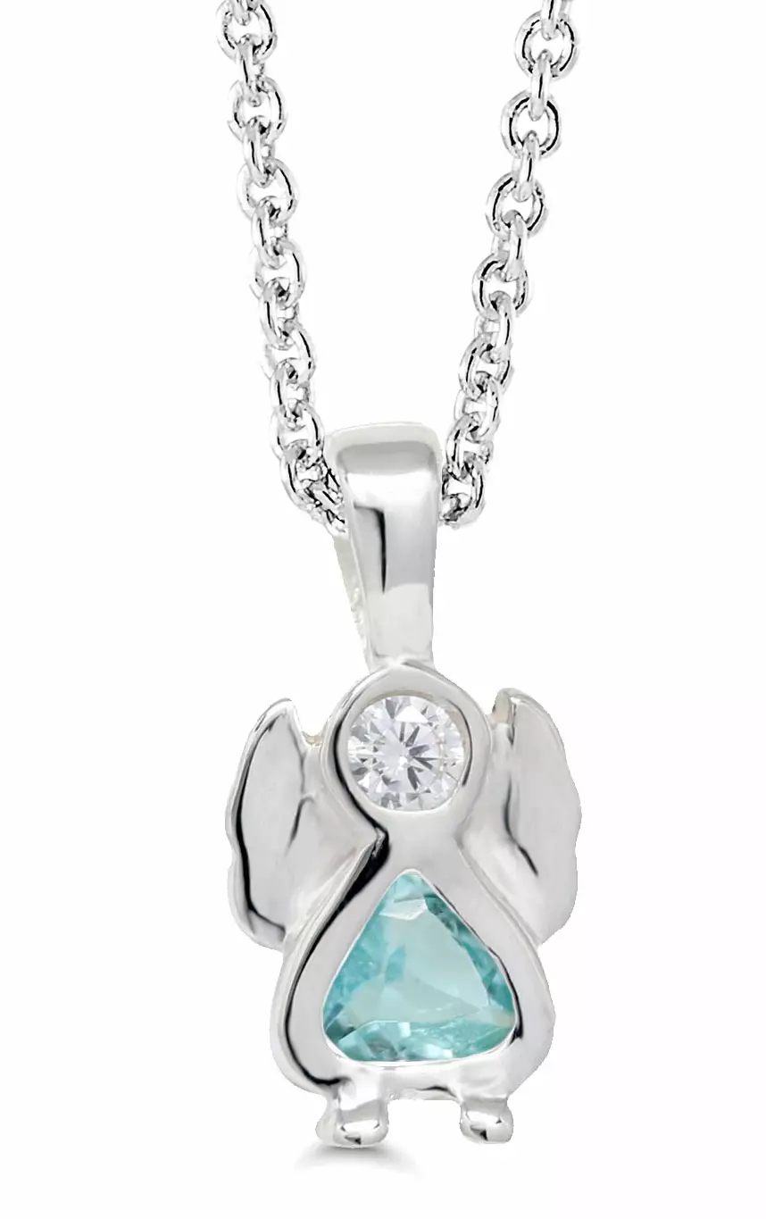 Hopeasta valmistettu siro enkeli riipus, sinisen värisellä zirkonilla.