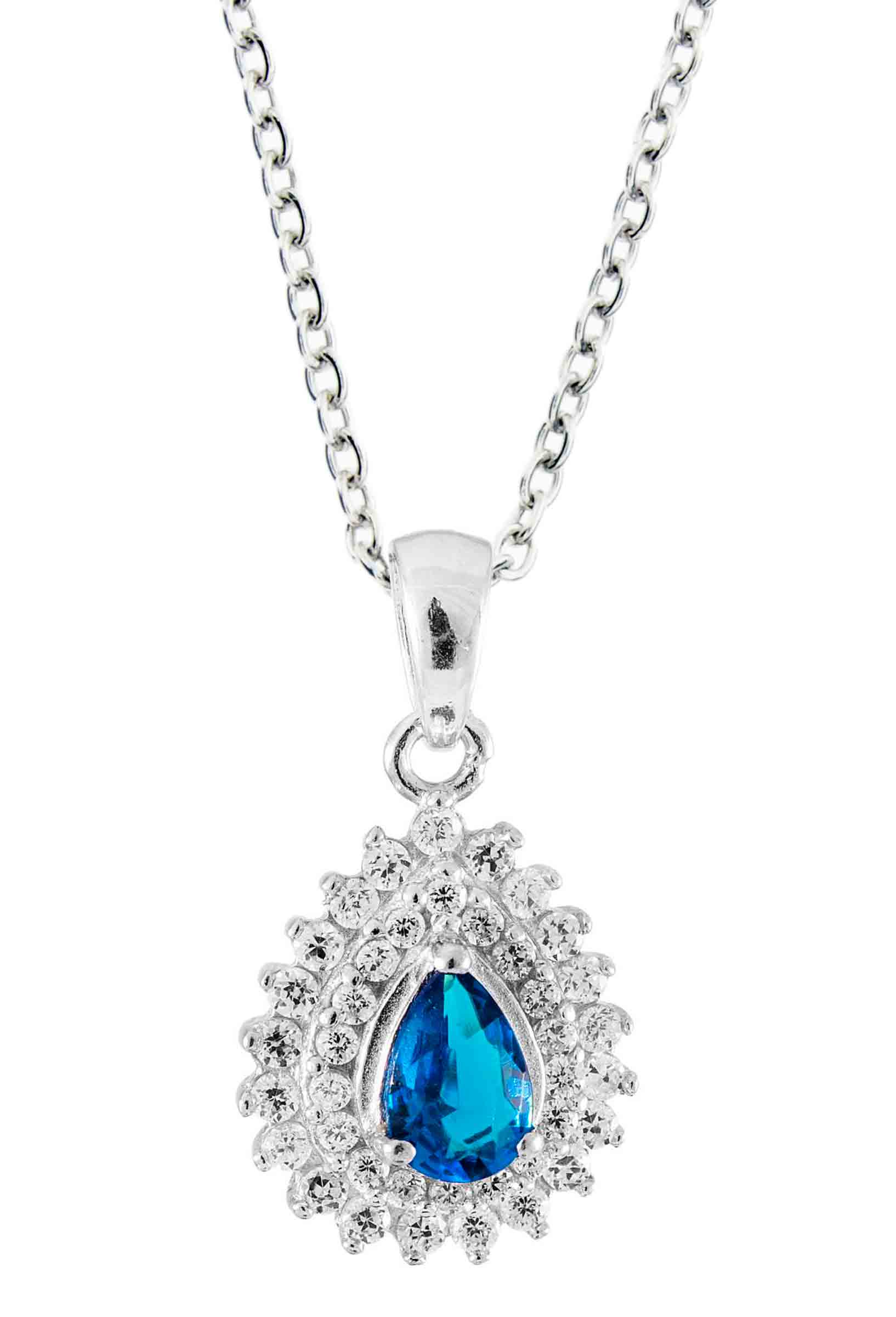 Siro hopenen riipus jonka pisaran muotoista sinistä katseenvangitsijaa reunustaa lukuisat kirkkaat zirkonit