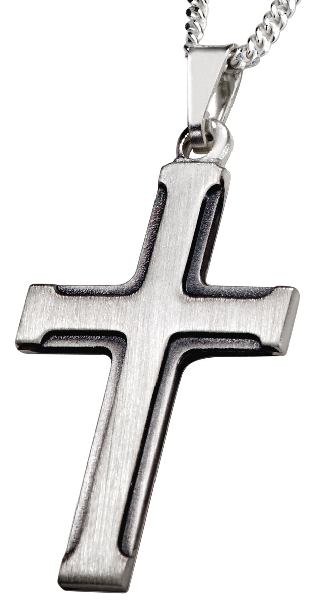 Hopeinen rippiristi, jonka reunoja koristaa komeat oksidoidut viisteet. Ristin koko 17 x 30 mm. Ketju tulee mukana, pituus säädettävissä välilenkin ansiosta joko 45 tai 50 cm.
