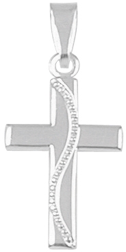 Tyylikäs hopeinen rippiristi, jossa "pystypuuta" pitkin kulkee näyttävä koristekuvio. Ristin korkeus on 20 mm ja leveys 11 mm. Riipuksen mukana tulee ketju, jonka pituus on säädettävissä pituuteen 42 cm tai 45 cm välilenkin avulla.