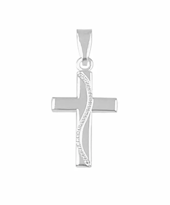 Tyylikäs hopeinen rippiristi, jossa "pystypuuta" pitkin kulkee näyttävä koristekuvio. Ristin korkeus on 20 mm ja leveys 11 mm. Riipuksen mukana tulee ketju, jonka pituus on säädettävissä pituuteen 42 cm tai 45 cm välilenkin avulla.