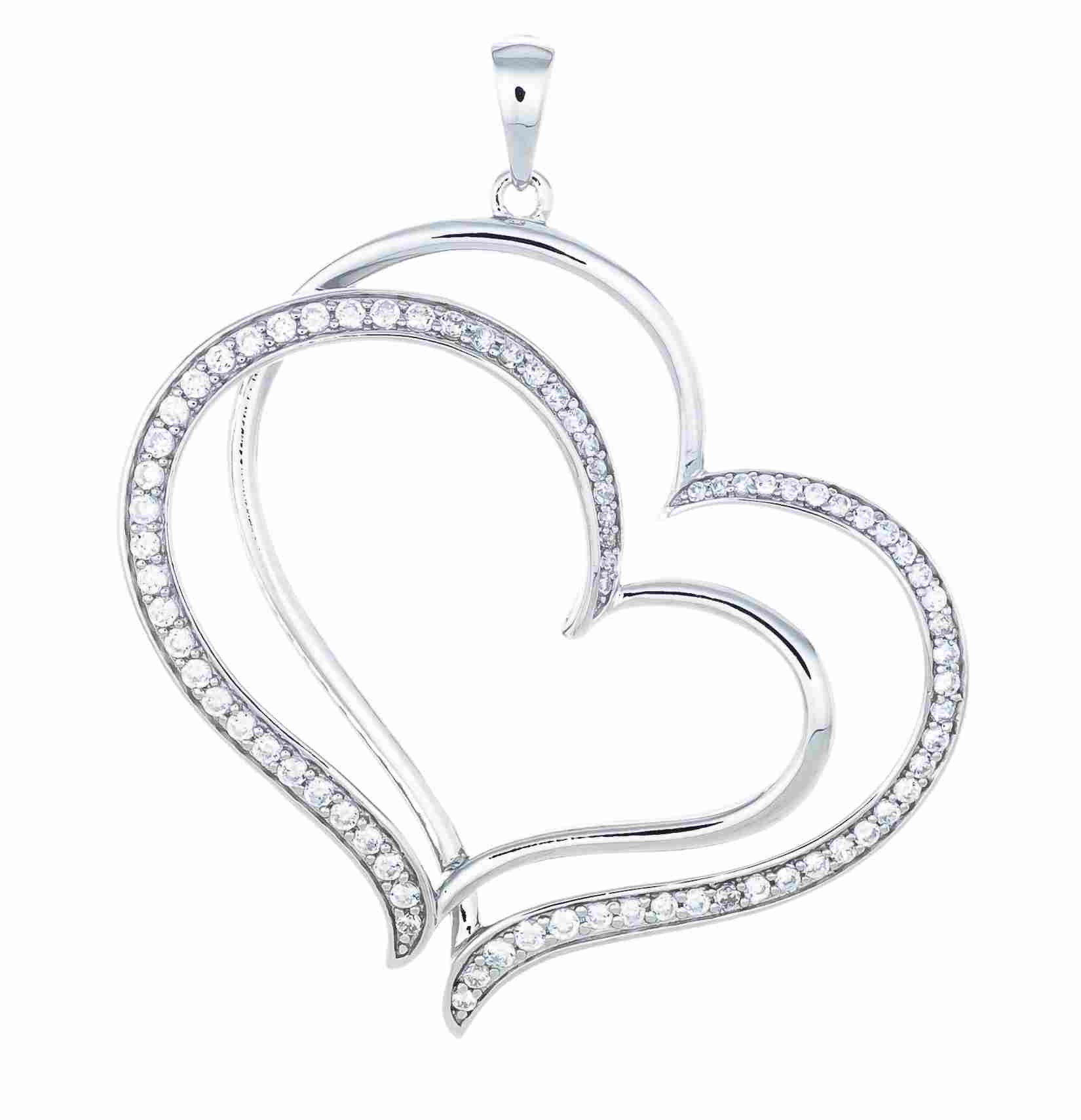 Tämä kaunis riipus muodostuu kahdesta päällekkäin asetetusta sydämestä, joiden toinen puolisko on koristettu kirkkailla zirkoneilla.