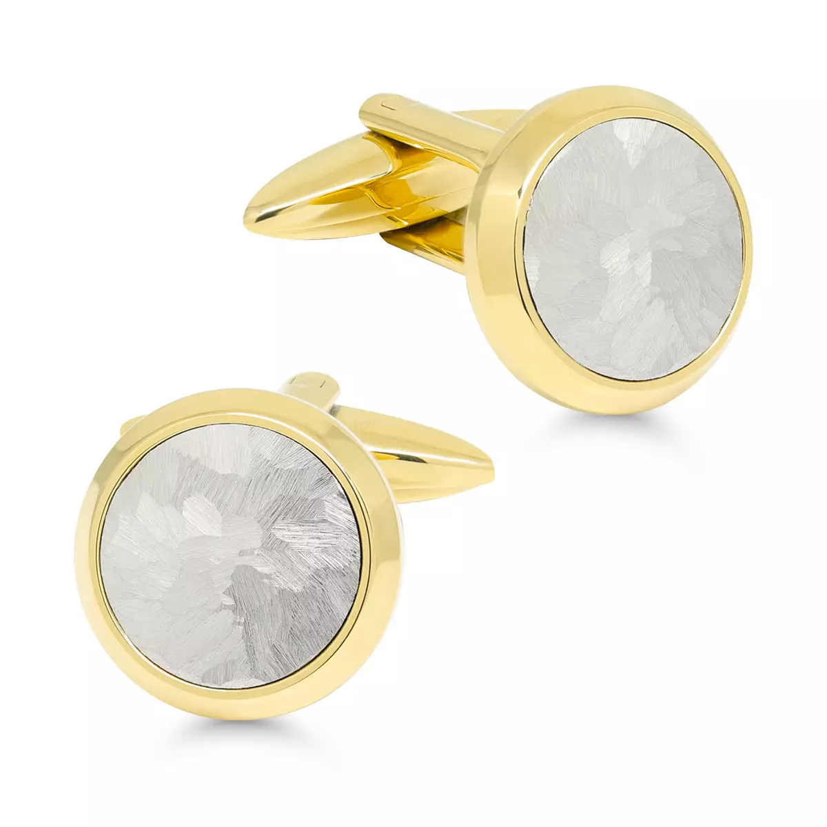 Ruostumattomasta teräksestä valmistetut kalvosinnapit. Kiiltävät kullatut reunat ja rustiikkinen tauottu keskusta.