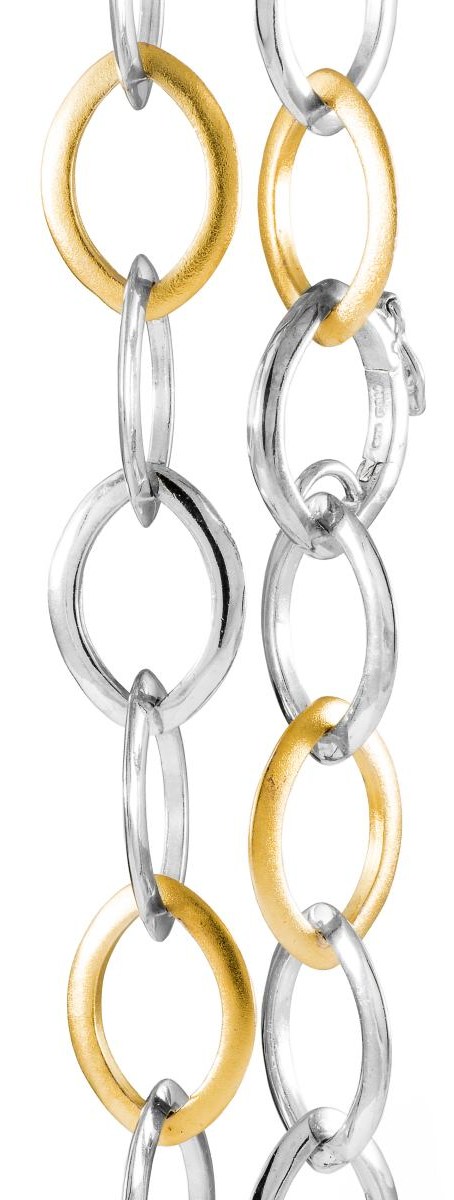 Upean näyttävä Sterling-hopeasta valmistettu kaulakoru, jonka joka neljäs lenkki on kullattu ja omaa mattapinnan. Lenkkien leveys on 13,8mm ja pituutta korulla on 44cm. Kaunis koru toimii erittäin hienosti vaikkapa juhla-asun elävöittäjänä, suoranaisena viimeistelijänä. Kaksivärinen koru ei myöskään sido käyttäjäänsä käyttämään pelkästään hopean- tai kullanvärisiä koruja.