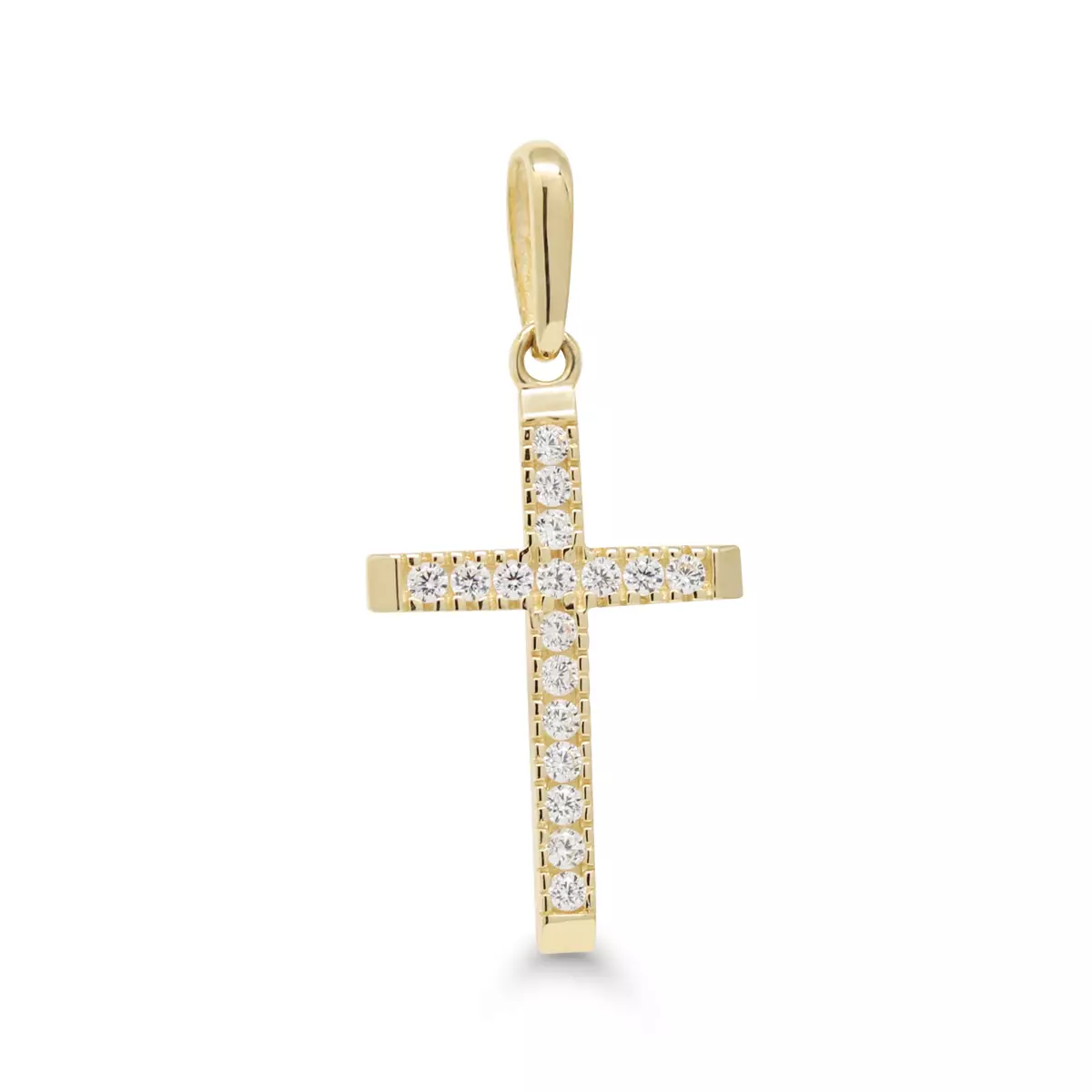 Keltakullasta valmistettu, upeilla zirkoneilla koristeltu risti.