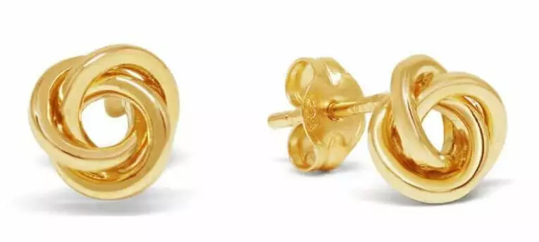 Keltakullasta valmistetut upeat solmu-malliset korvakorut. Kolme rengasta menevät toistensa läpi.
