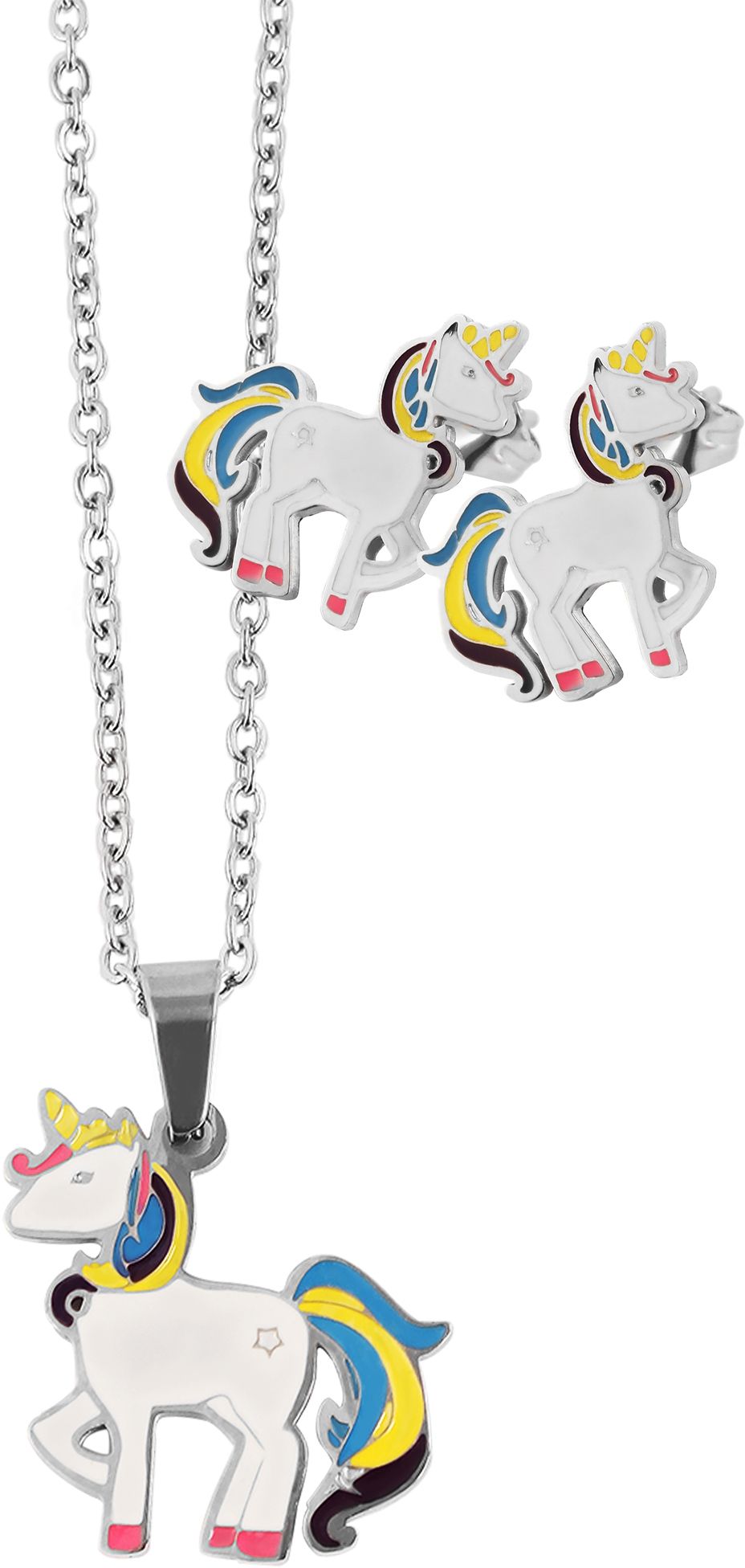 Korusetti Yksisarvinen SH98-001 Ketjun pituus: 43+5 cm Riipuksen levein kohta: 25 mm Tappikiinnikkeisten korvakorujen levein kohta: 12 mm