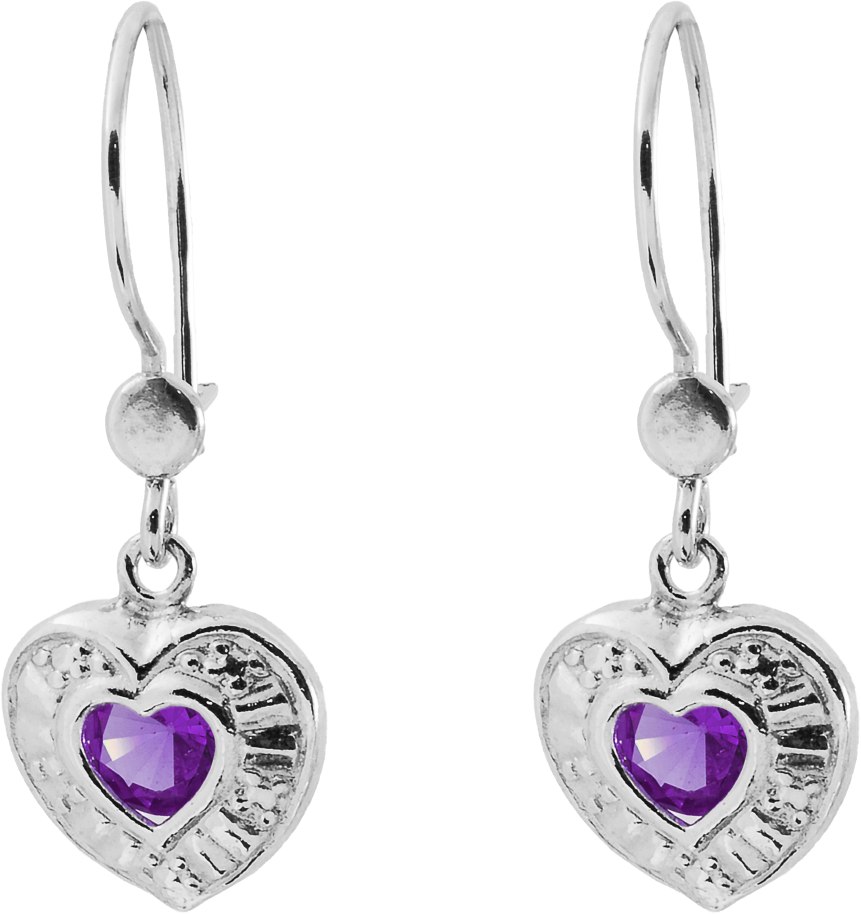 Sydän korvakorut lilalla kivellä. Kiinnitys korvakoruissa on koukku. Materiaalina korvakoruissa on käytetty hopeaa.